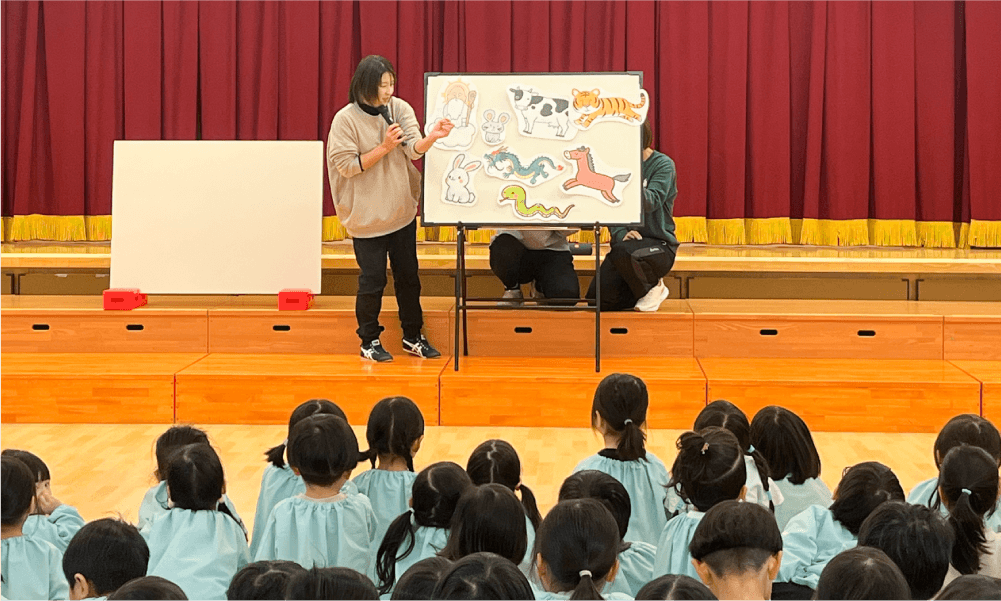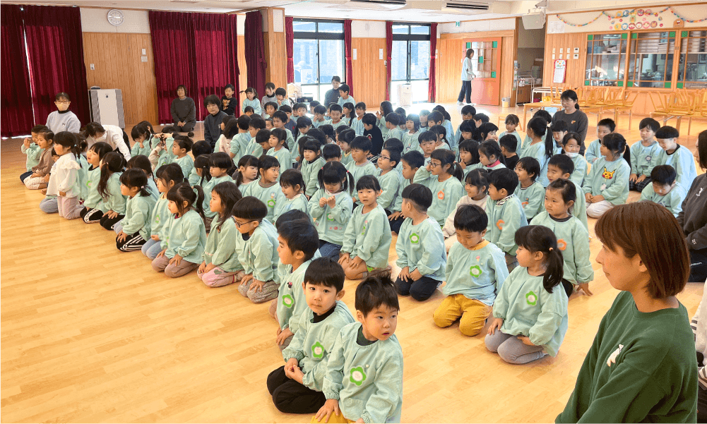 先生によるしめ飾りの説明から始まり、紙芝居形式で行う十二支の物語、園児全員で干支の歌の合唱など、新年にちなんだプログラムが行われました。