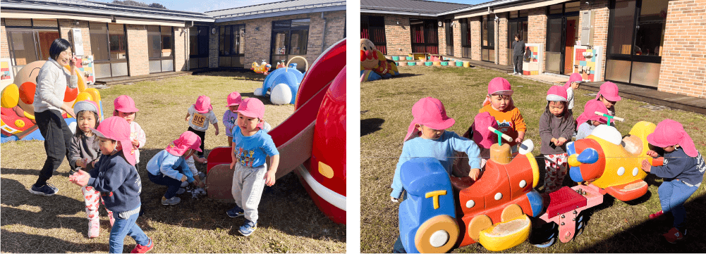ぐるりと一回り出来る回遊型の園舎には、日当たりの良い中庭があり、ここでは0歳児、1歳児、2歳児のこども達が元気よく遊んでいます。
