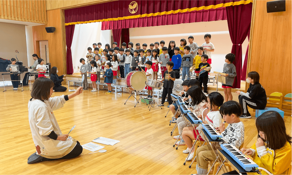 当園では年間を通じ、さまざまなイベントを企画していますが、取材でお邪魔したこの日は、11月に開催される音楽会の練習真っ最中。5歳児クラスでは歌のほかに楽器演奏も行います。
